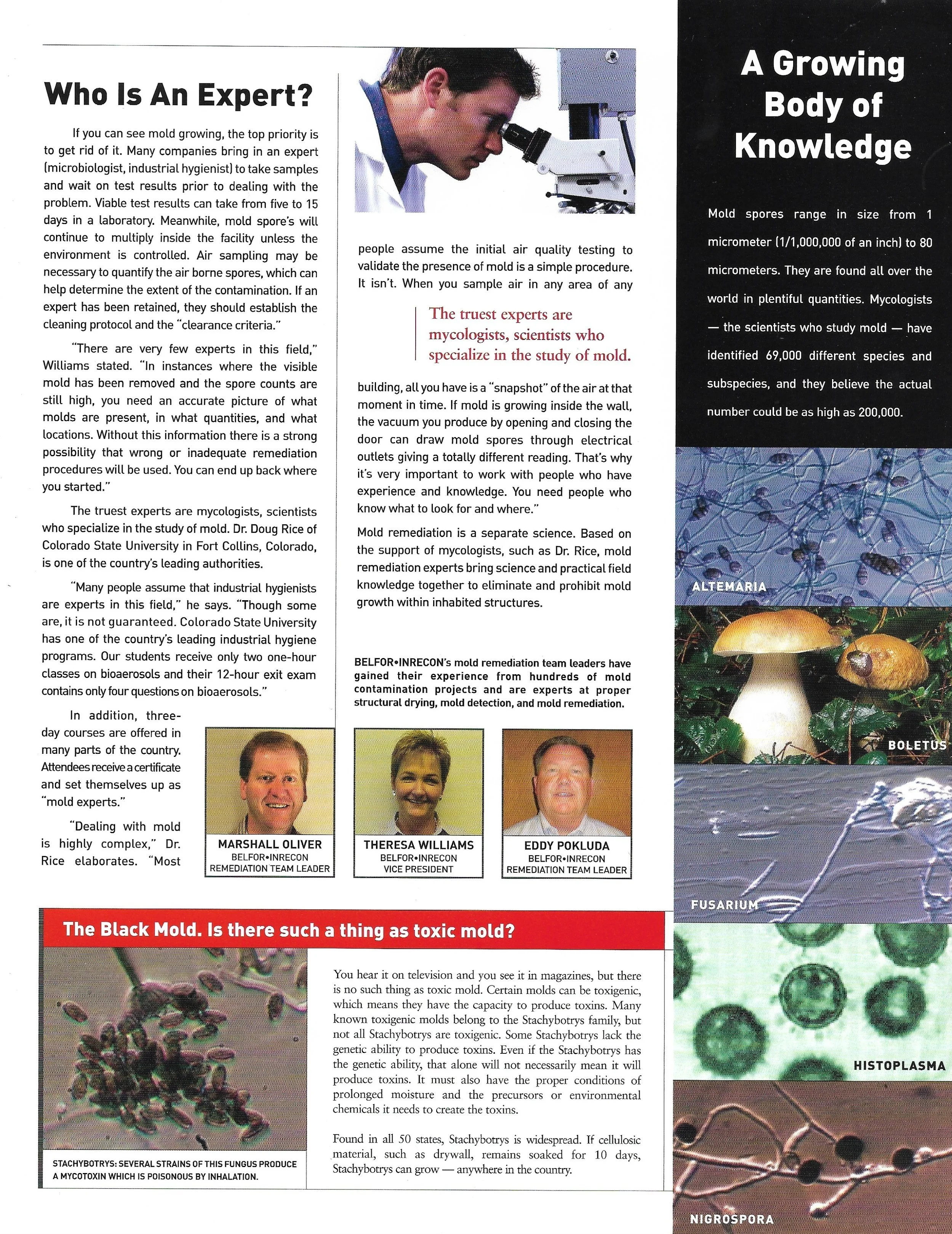 "There are very few experts in this field, Williams stated. "In instances where the visible mold has been removed and the spore counts are still high, you need an accurate picture of what molds are present, in what quantities, and what locations. Without this information there is a strong possibility that wrong or inadequate remediation procedures will be used. You can end up back where you started."