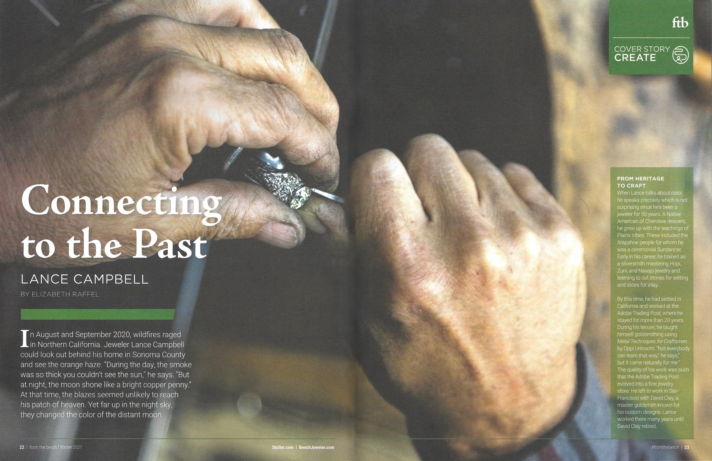 By this time, he had settled in California and worked at the Adobe Trading Post, where he stayed for more than 20 years. During his tenure, he taught himself goldsmithing using Metal Techniques for Craftsmen by Oppi Untracht. "Not everybody can learn that way," he says, “but it came naturally for me.” The quality of his work was such that the Adobe Trading Post evolved into a fine jewelry store. He left to work in San Francisco with David Clay, a master goldsmith known for his custom designs. Lance worked there many years until David Clay retired.
