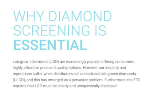 How many undisclosed lab-grown diamonds are you willing to sell? For us, the answer is zero. That is why we screen 100% of all colorless and near-colorless diamonds that pass through our hands. It is the right thing to do for you, your customers, and the industry. It is a question of integrity. It's also a requirement of the FTC Guides for the Jewelry Industry that product is correctly represented.