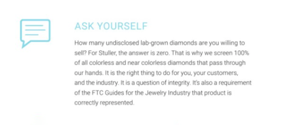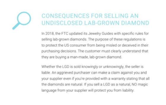 In 2018, the FTC updated its Jewelry Guides with specific rules for selling lab-grown diamonds. The purpose of these regulations is to protect the US consumer from being misled or deceived in their purchasing decisions. The customer must clearly understand that they are buying a man-made, lab-grown diamond. Whether the LGD is sold knowingly or unknowingly, the seller is liable. An aggrieved purchaser can make a claim against you and your supplier even if you're provided with a warranty stating that all the diamonds are natural. If you sell a LGD as a natural, NO magic language from your supplier will protect you from liability.