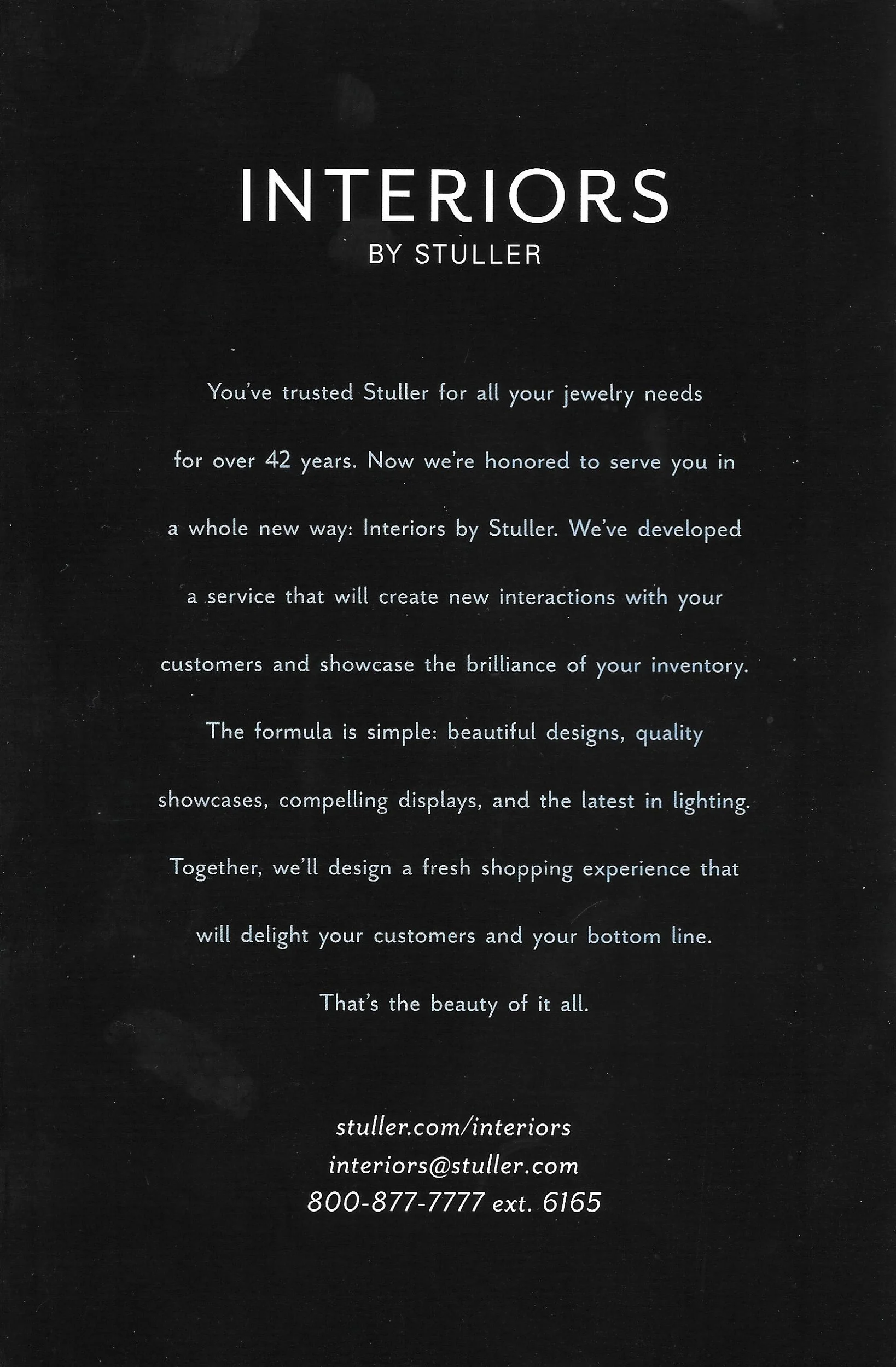 You've trusted Stuller for all your jewelry needs for over 42 years. Now we’re honored to serve you in a whole new way: Interiors by Stuller. We've developed a service that will create new interactions with your customers and showcase the brilliance of your inventory. The formula is simple: beautiful designs, quality showcases, compelling displays, and the latest in lighting. Together, we'll design a fresh shopping experience that will delight your customers and your bottom line. That's the beauty of it all.